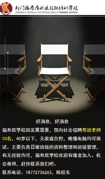 荆门福寿居职业技能培训学校是荆门市人力资源和社会保障局、荆门市行政审批局审批的正规职业技术培训学校,由荆门福寿居养老产业集团有限公司投资设立,主要面向社会招收18——65周岁社会人士,开展养老护理、母婴护理、小儿推拿等各类职业教育培训。学校教学场地1000平方米,实训基地1500平方米,学校教学环境优良,师资力量雄厚,管理规范,深受学员好评。
