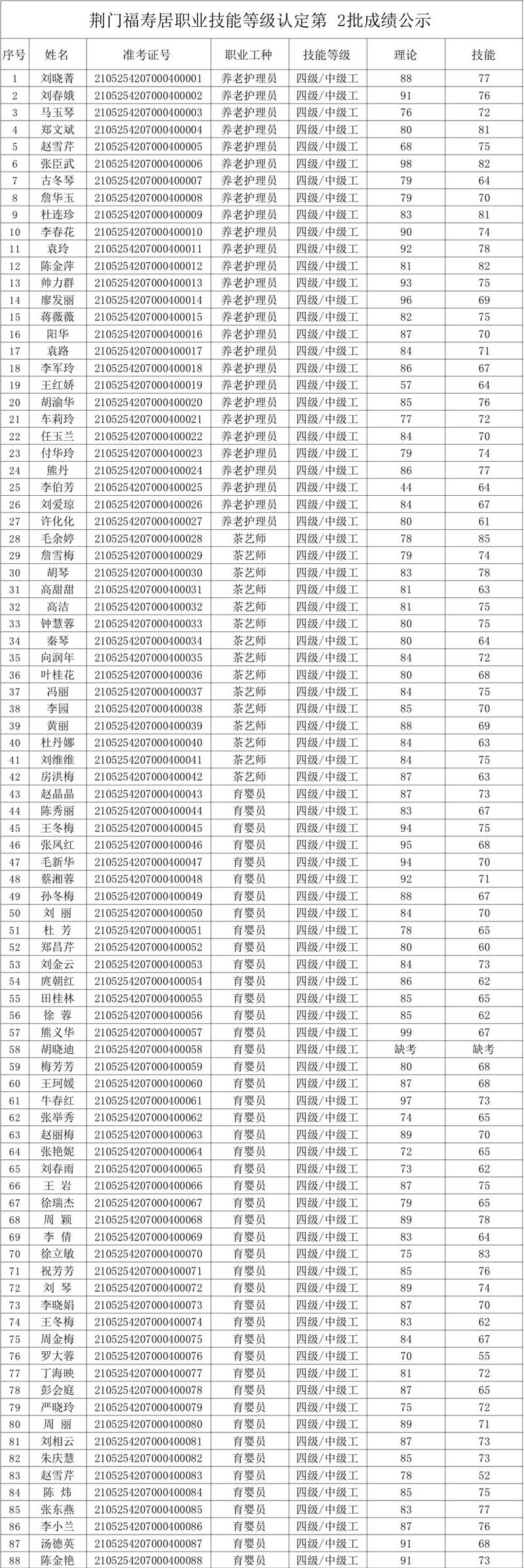 荆门福寿居职业培训学校第二批职业技能等级认定成绩公示