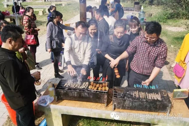 时间临近中午,秋游活动的重头戏上场了,那就是野外烧烤啦,几位男同事帮忙生火,准备烧烤作料,待火候到了,就一展拳脚。羊肉串、猪肉串、鱿鱼丝、热狗、鸡腿、茄子、韭菜、香菇等齐上阵,在几位大厨的手中呲呲作响,香味四溢,大家都被这香味深深吸引了,都跃跃欲试!很快,大家的战斗力就明显不足了,都嚷着肚子已经装不下了,称赞几位大厨的手艺高。