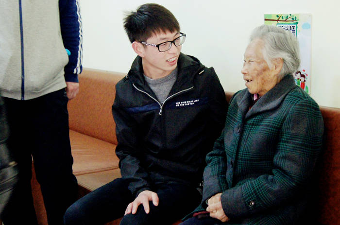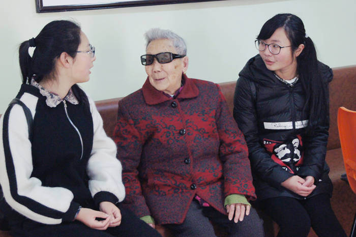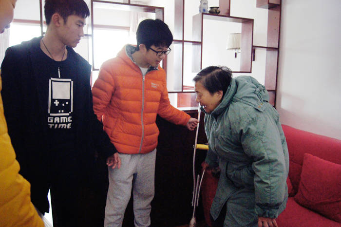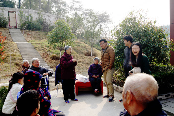 来到楼栋,进到爷爷奶奶们的家里,氛围却似乎紧张了起来,不知道怎么打开话题的学生们显得略有些不知所措。“来,坐,来沙发上坐”“谢谢你们来看我,我和爷爷很开心”看到爷爷奶奶们发自内心的笑容,心里的包袱一下子全卸掉了。他们有的在房间里和奶奶促膝交谈,有的在广场上和老人们谈天论地,还有的给老人们学动物叫,逗得大家哈哈大笑,老人们和学生们玩得忘乎所以。